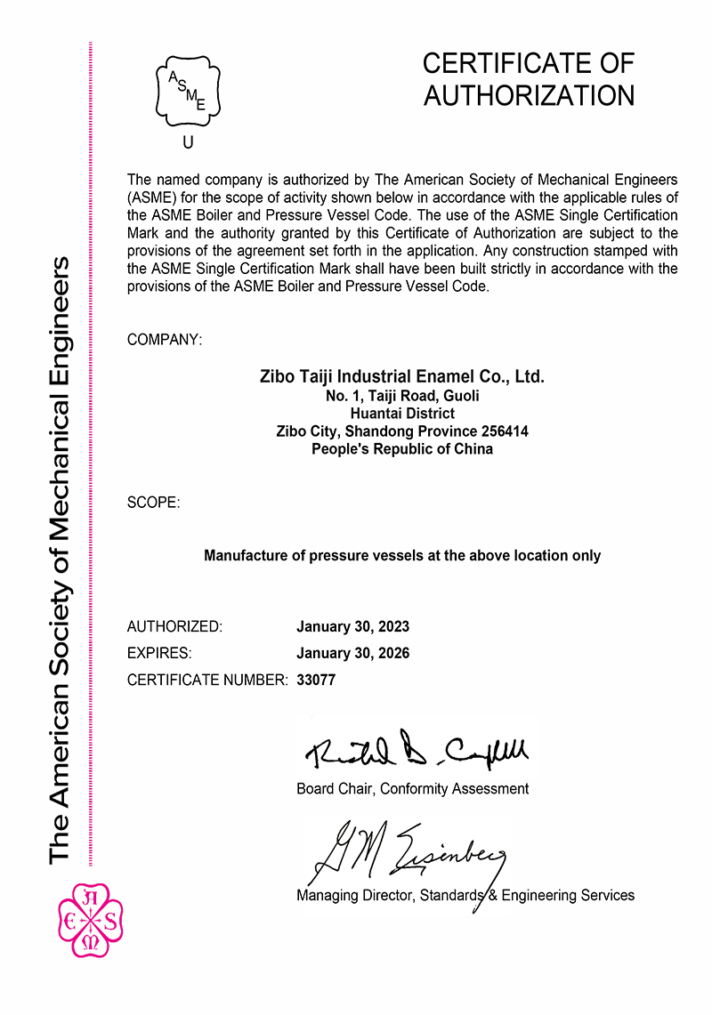 淄博太極在中國搪玻璃設備制造行業中首家通過ISO90001質量體系認證,并擁有美國ASME認證、歐洲PED認證以及國家部門頒發的搪玻璃制造許可證、進出口許可證和百余項榮譽證以及三十六項專利等。